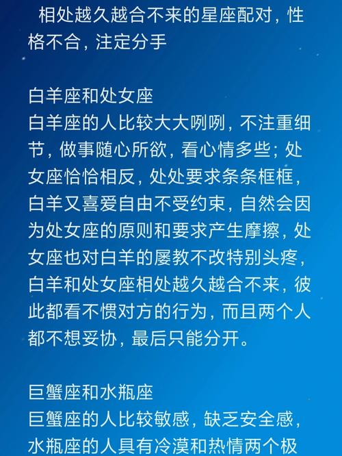 _巨蟹座的粘人和双子座的自由奔放,让两人在相处中不断摩擦,最终走向破裂。_