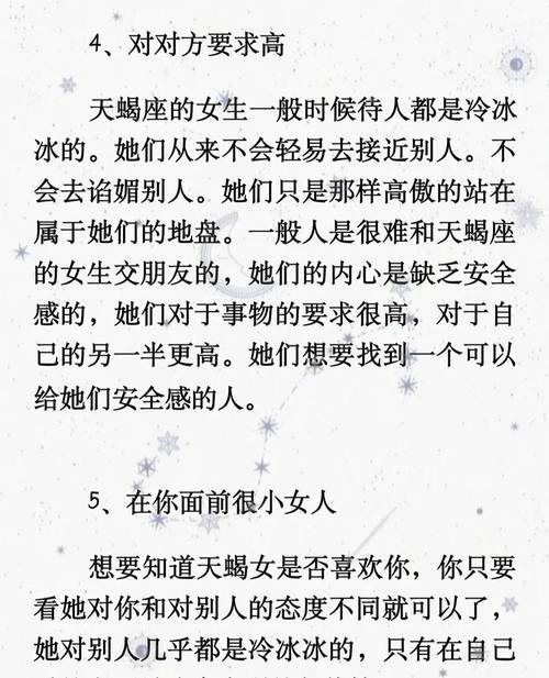 作为十二星座中最神秘、最深刻的星座之一,天蝎座有着非凡的情感世界。他们对爱情的需求远不止是简单的甜蜜和陪伴,而是对激烈而深刻的情感体验的追求。对于天蝎座女孩来说,爱情不是一种简单而浪漫的表面,而是一种、复杂的情感纠缠和深刻的灵魂联系。那么,天蝎座女孩到底喜欢什么样的爱呢?接下来,这篇文章将带你揭示他们对爱情的真正渴望。