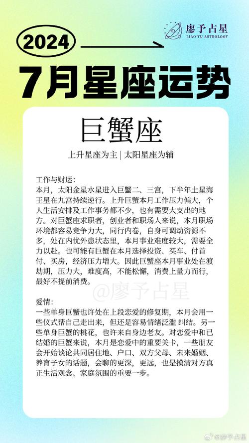 7月4日的巨蟹座是充满情感与创造力的个体,他们的直觉与敏感性使他们能够在生活中与他人建立深厚的联系。通过理解和探索这一星座的内心世界,我们可以更好地把握其潜在的优势与挑战。希望这篇文章能激发读者对巨蟹座的好奇心,进一步探讨星座对人类情感与行为的影响。