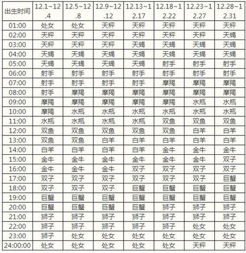 上升星座12月对照表
